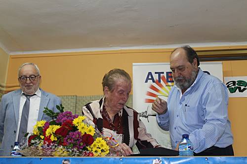 El pasado viernes, día 27, el Ateneo Mónico Vicente entregó su premio anual, este año el décimo, a Eugenia Esteras. Los sobrados motivos para este homenaje fueron, según puede leerse en la web del Ateneo, por ser: Un referente de la lucha por la dignidad e igualdad de la mujer en todos los ámbitos sociales, incluso dentro de la Iglesia católica, a pesar del machismo y conservadurismo de la misma. Un modelo de compromiso social con los más pobres y cercanos, vecinos, incluso en la dictadura y la represión de tantos años. Una impulsora de la formación, la cultura, la lectura, como herramientas transformadoras de las personas y de la sociedad. Un modelo adelantado del dialogo y colaboración con militantes y personas de otras ideologías y partidos, destacando lo que a todos unía: el servicio al ser humano concreto y al bien común. Eugenia, que cuenta con 96 años, nació en Embid de Ariza (Zaragoza) y en 1947 se traslado, junto con su marido, a vivir a Soria, concretamente en la Barriada, donde trabajó codo con codo con Mónico Vicente. Con él fundó la primera asociación de vecinos de Soria, Asociación de Vecinos de la Barriada. Con Gregorio Alonso dieron el paso para unificar los elementos femenino y masculino de la HOAC. Dedicó Eugenia mucho entusiasmo a la difusión de libros de la Editorial ZYS, en los que se difundía la cultura obrera y social. Una mujer luchadora y valiente, que apoyaba a los presos políticos y a sus familias y mantenía siempre abiertas las puertas de su casa para ellos. El Ateneo Mónico Vicente, fundado en 2008, es, a decir de ellos mismos en su acta fundacional, “Un modelo de cultura no intervenida”. Así lo viene demostrando en todos sus años de andadura. El primer premio lo concedieron a Marcelino Camacho, tan ligado a Soria, concretamente a La Rasa. El nombre de Mónico Vicente no puede ser más acertado. Mónico, a quien conocimos en su modesta, como todas, casa de la Barriada, fue un luchador, como Eugenia y como Marcelino, nombres de referencia en Soria, gentes que lucharon contra el franquismo en unos años donde se jugaban (se jugaron) la libertad. El acto, presidido por Manolo Madrid, tuvo lugar en un abarrotado salón de actos de la Asociación de la Barriada. Una Eugenia Esteras muy emocionada, escuchó a los intervinientes y vio un pase de fotos que repasaba su vida.