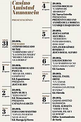 Un año más, y van once, el Departamento de Cultura del Ayuntamiento de Soria se ha volcado en lo que ya se va convirtiendo en un clásico, Expoesía, o la Feria del Libro. Como es habitual, la programación ha sido intensa, con actividades también para niños, las casetas de librerías y editoriales, y las presentaciones de distintas publicaciones. Pero también conciertos, entre los que cabe destacar el de Amancio Prada, y recitales de poesía.