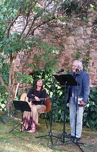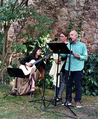 Causantes de esa calidez y emoción fueron los componentes de El Letrerío: Susana Gómez Redondo, Lucas Caraba y a la guitarra Elena de Nicolás. La hermosa y precisa voz de Susana se completaba con la rotunda de Lucas y los dos, esperaban el momento musical, la entrada, que les daba la guitarra de Elena, de donde salió todo tipo de música, como diría fray Luis de León, refiriéndose a Francisco de Salinas “... la música estremada, por vuestra sabia mano gobernada”. Y entonces Susana y Lucas leían trozos de la vida de José Tudela, o recitaban poemas de su buen amigo Antonio Machado, recordaban el buen hacer de doña Cecilia como intelectual, como esposa y como madre y abuela. Recordaron la tertulia de notables, que se dio en llamar “tertulia de los cráneos”, los trabajos etnográficos de don José, los artículos que sus amigos le dedicaron y, todo ello, consiguiendo que la tarde se hiciera corta, que nadie se moviera de su asiento, que todos miraran fascinados a ese trío que, pese haberse formado de manera casual, ha resultado un regalo cultural importante.