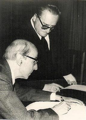 Con su amigo Gerardo Diego “ Según te voy dando nombres, pienso en que ya tengo muchos más amigos en El Espino que paseando por la Dehesa. Sobre esto voy a contarte que no hace mucho, una confusión de un diligente cartero soriano, me dio de baja en el mundo de los vivos. El caso es que llegó a nuestra casa de Soria una carta de Bellas Artes, y el cartero debió hablar con algún vecino quien le manifestaría que no me veía últimamente, lo que tiene su motivo, ya que en el pasado año, por motivos de salud, fui a Soria menos veces de las que deseaba; y entre el cartero y el informante, decidieron que lo normal, y dado que ya era muy mayor, es que me encontrase en la nómina de los difuntos. Pero a pesar de haber devuelto la carta a su destinatario, poniendo como posdata: “ Fallecido”, sigo vivo, continuando mi trabajo, sin perder nunca la ilusión de la obra emprendida, y entusiasmado por la respuesta a este homenaje que me habéis tributado, y que por primera vez en mi vida he aceptado. En la escasa resistencia opuesta habrá contribuido mi inevitable debilidad somática, pero también mi ofrecimiento a los Pérez Rioja que me han precedido, desde mi tatarabuelo Antonio, instalado en la ciudad a fines del XVIII, y también a mi mujer Carmen- de otra muy larga estirpe soriana, la de los García de Diego y García Segura-, el mejor regalo que me ha hecho Soria, y por quien mi vida aún tiene alguna razón de ser y de existir.”