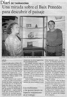 Isabel Goig y su hijo han recorrido la comarca y ya son autores de otros trabajos como Una mirada sobre el Tarragonès. la familia también se ha implicado con la creación a cargo de Luisa Goig de la página web www.tarragona-goig.org donde se recogen fotografías, historias y experiencias tanto del baix Penedès como del Tarragonès. La página también dispone de un espacio para la participación de vecinos y lectores para que incorporen consejos de visitas. Una mirada sobre el Baix Penedès tiene una especial vista hacia las tradiciones y sus gentes y también recupera imágenes antiguas. El libro se presentó en la casa museo Carlos Barral de Calafell, una de las pasiones literarias confesadas por la autora del trabajo de la comarca. © J.M.B. Diari de