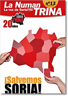 Nº 13 En la portada ¡Salvemos Soria! 20 años reivindicando lo mismo y aquí siguen, inasequibles al desaliento. En este número hacen un balance de sus actuaciones y su compromiso, ingente, y también de los logros, casi inexistentes. La Plataforma se creó en enero de 2001 y significó un revulsivo para la sociedad. Desde entonces no han parado de reivindicar: manifiestos, acuerdos ciudadanos, contactos con otras zonas en similar situación que Soria, caravanas lentas hacia Madrid, llamamientos..., pero la población sigue bajando sin nada que lo remedie llegando, en enero de 2021 a 88.884 habitantes, la mitad del comienzo de la serie. Con promesas, pero sin realizaciones. Las autovías van pariendo kilómetro a kilómetro con mucho dolor. Los trenes parados. El acceso a Internet limitadísimo..., todo esto y más puede leerse en La voz de Soria ¡YA!, además de la sección titulada ¿Y qué hacen nuestros políticos?, legislatura a legislatura, repasan los logros de quienes están obligados a eso, precisamente, a lograr.. En la contraportada se han recogido los titulares de los periódicos cuando, en 2001, se constituyo la plataforma. No les gustó mucho esta formación, aseguraban que para eso estaban ya los políticos y se quedaron tan anchos.