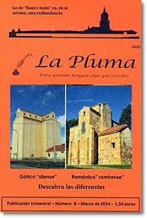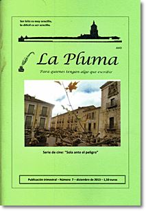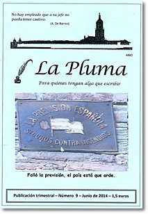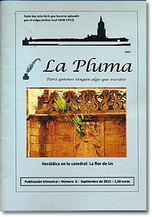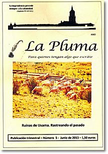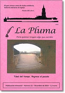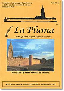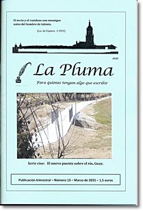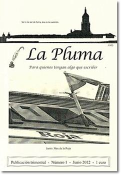 Cada número son más -abonece, se dice por los lares sorianos- quienes tienen algo que escribir, lema de la revista literaria La Pluma, que camina con paso firme a través de los 13 números publicados hasta el mes de marzo de 2015. La revista es una mezcla, desde sus inicios, de mazo que no cesa de dar, narrativa, poesía, comentario de libros, humor gráfico, y un fray Cuchara que se empeña en que cocinen hasta los más ineptos, capaces de mezclar torreznos con leche merengada. De todo ello se encargan en este número, además de Javier Nicolás y Carlos Robredo, que coordinan y dirigen, Antonio Millán, Carlos Aranda, Ana Balbás, Alfonso Bengoechea, Teresa Frías, Antonio Moreno, Beatriz Rincón, Elena Robredo, Susana Maroto, Julio Pina Fernández, Aurora Robredo, Cathy Dunn, Javier Millán Mainar, Margarita Córdoba Galve, Carmen Guíu Tobías, y Blanca López Campos. Resaltar que dan con el mazo a los permisos urbanísticos que otorgan los municipios, y que permiten despropósitos, cuando no barbaridades, a lo largo y ancho de la provincia, ejemplarizado en una construcción del pueblo de Gormaz.