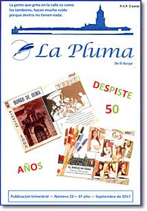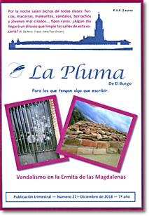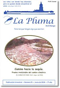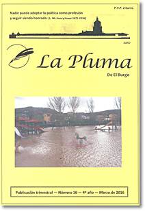 Me disponía a comentar la revista La Pluma de el Burgo como cada trimestre, de manera más o menos mecánica. Al leer una de las secciones que más me gustan, “Con el mazo dando”, tres nada menos, y continuar con “Lo que dicen los lectores”, me he identificado tanto, que he sentido como si lo hubiera escrito yo. En realidad es lo que el cuerpo me pide escribir un día sí y otro también, pero practico aquello que alguien, no recuerdo, escribió, eso de que se ayuda más a las personas o los colectivos otorgándoles una imagen favorable de ellos mismos que enfrentándoles constantemente con sus defectos. Pero no sirve de nada. ¿Qué pasa en los pueblos? El todo vale en las fiestas, no sólo en los pueblos pequeños o grandes, también en la capital. ¿Qué esperan de las personas que se instalan? ¿Realmente los sorianos quieren que algo cambie en esta provincia? Lean este número de La Pluma y hallarán algunas respuestas. En la misma línea reivindicativa o, tal vez, hasta los..., se interpreta “Una España nueva”, poema de Carlos Robredo. El resto de contenidos lo cubren autores fijos, leales y constantes de La Pluma: Teresa Frías, Carlos Aranda, Beatríz Rincón, Isabel Goig, Julio Pina, Alfonso Bengoechea, Ana María García, Pedro Navazo, Freia Nicolás, y Javier Millán.