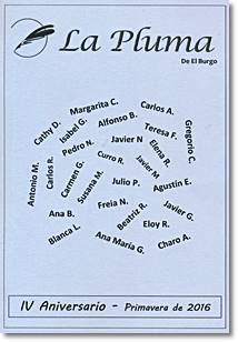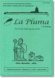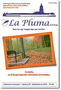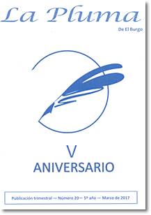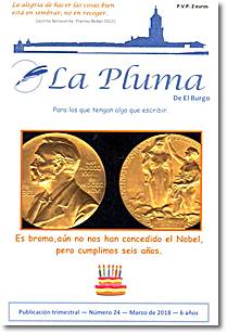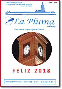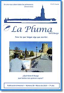 Para quienes tengan algo que escribir De nuevo La Pluma, dirigida por Carlos Robredo y Javier Nicolás, editada por la Asociación Cultural La Pluma del Burgo, ofrece a sus lectores unas interesantes páginas de Poesía, Narrativa, acontecimientos varios de la Villa burgense, opinión, humor e ingeniosidades varias, como la novedosa sección incorporada que recoge los mejores tuits hallados en las redes. La Pluma nació con la inquietud de ser, en especial, un espacio para la narrativa, y buena parte está dedicada a ella y a la Poesía, gracias a las plumas cargadas de alma de: Teresa Frías, Carlos Aranda, Carlos Robredo, Alfonso Bengoechea, Antonio Moreno, Carmen Guíu, Susana Maroto, y Beatriz Rincón. De la sección “Citas célebres” queremos destacar una de C. Robredo (“esta cita aún no es célebre”, dice): “El que odia, y por ello denuncia cosas superfluas, que no delitos, merece ser castigado con nuestro desprecio”. A ver qué le parece a Carlos esta de Cernuda, que puede muy bien hermanarse (o al menos emparentarse) con la suya y también retrata a varios y variados colectivos: “Triste sino nacer/con algún don ilustre/aquí, donde los hombres/en su miseria sólo saben/el insulto, la mofa, el recelo profundo/ante aquel que ilumina las palabras opacas/por el oculto fuego originario”. Cernuda.