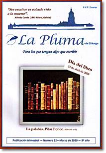 En la editorial de este número los directores de la revista anuncian el cese de la misma en el actual formato que nos ha acompañado durante casi diez años. No desaparece, no, sencillamente cambia su formato y lo acomoda a los tiempos presentándola de forma virtual. Además fusionan La Pluma y el boletín virtual Entre plumas. Más allá de dejar de publicarse en papel, la revista seguirá ofreciendo textos, cultura, relatos y poemas. Acaba el editorial con la frase ¡Larga vida a La Pluma!, deseo al que nos unimos. Este último número en papel, el 35, se abre con la editorial; Pretérito imperfecto, de Eloy Rioja; una entrevista realizada por J. Nicolás a la escritora Isabel Goig; y un recuerdo a prestigiosos españoles casi olvidados, que recuerda al médico Javier Balmis Berenguer y al científico Agustín de Betancourt, planificador de San Petersburgo. En otro apartado recuerdan también al gran Miguel Delibes y de él remarcan una frase muy en su sintonía: “La Cultura se crea en los pueblos y se destruye en las ciudades”. Recuerda asimismo a Ludwig van Beethoven, a Joaquín Salvador Lavado Tejón, “Quino”, inseparable de su Mafalda y, cómo no, a Gustavo Adolfo Bécquer. En el apartado de narrativa, las muy buenas plumas de Javier Nicolás, Julio Pina, Alfonso Bengoechea, Pero Navazo, Teresa Frías, Ángel Cuesta y Magdalena Landa, nos acompañan y nos hacen reflexionar. Otro tanto puede decirse de los poetas, que comienza con un poema de Antonio Machín -”Navidad”- y siguen otros de Carlos Aranda, Carlos Robredo, Ángel Cuesta, Aitana Palomar y Sara Peña. Lo dicho, larga vida a la Pluma en este su nuevo formato.