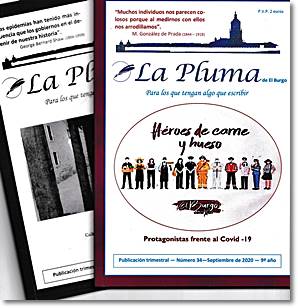 La Pluma sigue cumpliendo su compromiso pese al virus maligno. Como puede verse en las portadas, en una se recuerda a quienes se fueron (incluso eliminando la página de humor) y en la otra se homenajea a los héroes de carne y hueso, esos que han hecho posible el alivio en tiempos del Covid. Javier Nicolás escribe de dos grandes escritores: Dionisio Ridruejo y Antonio Machado. En la número 34 entrevista a Fernando Sánchez Dragó. El mismo Nicolás en el apartado de narrativa, recuerda su infancia en Casarejos, donde vuelve a leer a Dionisio Ridruejo. En la sección de narrativa, además del anterior, las eminentes plumas de los habituales de la revista: Carlos Robredo, Julio Pina, Alfonso Bengoechea, Pedro Navazo, Ángel Cuesta, Susana Maroto y Magdalena Landa. En Poesía los no menos eminentes Carlos Aranda, Carlos Robredo, Asunción Alcoceba y Sara Peña. En el número 34 se homenajea, con el poema-canción “Tatuaje” a Rafael de León, que fue IX conde de Gómara y a quien, por ausencia de descendencia, sucedió su sobrino. También en la número 34, A. Domínguez se despacha a gusto, y con razón, con el felón Fernando VII. En fin, esto y mucho más, puede leerse en La Pluma, cuya adquisición recomendamos vivamente para disfrute de los sentidos y del conocimiento.