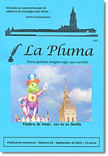 Diez números, más de dos años, de la Revista La Pluma, “Para quienes tengan algo que escribir”, publicación de narrativa, sin más pretensiones que dar a conocer, precisamente, aquello que narradores y poetas tengan que escribir, quieran escribir. Y en este número redondo, el 10, han escrito Poesía: Carlos Aranda, Carmen Guíu Tobías, GX Cantalapiedra, y Carlos Robredo. Narrativa: Alfonso Bengoechea, Teresa Frías, Julio Pina Fernández, Beatriz Rincón, Carlos Aranda, Susana Maroto, Artur Roczniac, y Yeimi Katerine Tarazona. De la opinión, “Iguales para hoy”, se ocupa Javier Millán Mainar. Carmen Guíu Tobías, comenta la película del director Luc Besson, “Lucy”. Blanca López Campos recomienda libros. Carlos Robredo da consejos sobre el uso del sombrero en los caballeros, en Curiosidades. La entrevista de este número es para Justo Mateo, director de peña. Cosas de aquí, está dedicada a las escuelas de Bayubas de Abajo, “distinguidas por su interés arquitectónico”, a cargo del director del CEINCE, Agustín Escolano. Se completa la publicación con las secciones fijas: La imagen, Calles de El Burgo (Carlos III), Con el mazo dando, Citas célebres, Humor, y el Salero de fray Cuchara (que sigue con sus cócteles). Recordamos que la Revista La Pluma está dirigida por Carlos Robredo y Javier Nicolás y editada por la Asociación Cultural La Pluma Del Burgo. Para enviar colaboraciones o suscribirse: laplumadelburgo@gmail.com