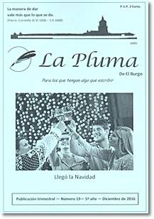 La Asociación Cultural La Pluma de El Burgo han editado un número especial de la revista La Pluma dedicado a la Navidad. Además de las secciones habituales: comentario de libros por Blanca López, de cine por Carmen Guíu, poesía de C. Aranda, entrevista a Ángel Hernanz, citas célebres, el salero de fray Cuchara, grandes autores (Lope de Vega), y pretérito imperfecto, los encargados de los relatos navideños (más o menos ortodoxos), han sido: I. Goig, A. Bengoechea, T. Frías, J. Pina, A. Balbás, J. Nicolás, S. Maroto, C. Robredo y P. Navazo. Destacar que la ilustración del Belén de la portada, Pesebre popular soriano, ha sido cedida por la Asociación Belenista de El Burgo de Osma.