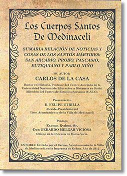 “Los Santos no son antiguallas nostálgicas, que nos recuerdan a personas que fueron muy importantes en su momento en la vivencia de la fe, pero que en la actualidad no tienen nada que decirnos. Los Santos son siempre vidas ejemplares y testimonios vivos que tienen mucho que decir a los hombres y mujeres de todos los tiempos, porque ellos vivieron de manera heroica las virtudes cristianas. Este es precisamente el caso de los santos mártires San Arcadio, San Probo, San Eutiquiano, San Pascasio y San Paulino, “LOS CUERPOS SANTOS DE MEDINACELI”, que así se les conoce. Ellos fueron creyentes auténticos que, ni las persecuciones, ni la muerte les asustó en ningún momento con tal de mantenerse fieles al Dios en quien creían con toda su alma. La persecución de los Vándalos en el Norte de África les sometió a toda clase de vejaciones, tormentos y persecuciones, les privó de sus posesiones y de cuanto componía su vida, les sometieron a torturas inhumanas, pero de lo que nunca lograron privarlos, fue de su fe, ni de la confesión de la misma en el Dios de Jesucristo, al que valientemente permanecieron fieles hasta la muerte. (…). Yo creo que este libro, cuyo autor es un creyente convencido y practicante, puede servir y mucho, desde el testimonio de los santos mártires, para animar a muchas personas, en la actualidad no creyentes o que tienen una fe excesivamente mustia y casi en estado comatoso, a lograr la valoración de la misma y a reavivar sus convicciones cristianas más profundas, que den sentido a toda su vida, sentido que, desgraciadamente, por unas circunstancias u otras, la mayoría de las veces, fruto del laicismo reinante en este momento de nuestra historia, se ha dejado atrapar por sus garras y sólo son en este momento víctimas del materialismo y el hedonismo reinantes. (…). Es una obra en la que se encuentra todo un cúmulo de curiosidades históricas y también de datos formativos, eruditos y bien documentados sobre las devociones a los santos y los favores y sanaciones que los mismos realizaron en la Villa de Medinaceli a los más diversos personajes que se pusieron bajo su especial protección y que motivan que, esta Villa sea realmente un centro de culto y devoción a los mismos. (…)”. Del prólogo de Gerardo Melgar Viciosa, Obispo de Osma-Soria. Carlos de la Casa se propuso cumplir tres objetivos con este trabajo: ofrecer una visión lo más completa posible de los aconteceres de los cinco mártires. Comentar la historia desde la llegada de sus reliquias a Medinaceli hasta alcanzar los Rezos correspondientes, y sus repercusiones en Salamanca y Medinaceli. Exponer otros materiales que pudiesen enriquecer el conocimiento de la vida y los estudios realizados por esos personajes. Este libro es, pues, un trozo más de historia de la provincia de Soria, concretamente de Medinaceli, que el Dr. De la Casa acaba de publicar.