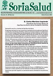 otoño/invierno 2020 El ejemplar que tienen en sus manos es el resultado de la encuesta que Caja Rural, a través de su Fundación Científica, realizó la primavera pasada en colaboración con el Ilustre Colegio Oficial de Farmacéuticos de Soria (oficinas de farmacia), para conocer los SIGNOS, SÍNTOMAS Y SECUELAS del COVID-19 en los hogares sorianos. Todas las encuestas fueron anónimas. Contamos con la colaboración de numerosas entidades públicas y privadas que apoyaron nuestra propuesta. (...) Quisiéramos, con esta publicación, agradecer el esfuerzo individual y colectivo de muchísimas personas anónimas: médicos y personal sanitario y no sanitario; fuerzas de seguridad-policía; Ejército-UME; 112; SAMUR; bomberos, voluntarios, y un largo etcétera de personas anónimas, que a lo largo de estos meses de pandemia han dado el máximo para combatir el virus. Gracias a todos ellos.(...) Queremos también que este SORIA SALUD 25 sea un HOMENAJE de nuestra institución a todos aquellos que han fallecido en este periodo pandémico. Esperamos que todo regrese a un periodo de salud y bienestar en los próximos meses.