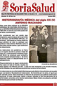 invierno 2022 HISTORIOGRAFÍA MÉDICA del siglo XX (V) ANTONIO MACHADO Hace unos años publiqué en la REVISTA ESPAÑOLA DE ANATOMÍA PATOLÓGICA y en la HISTORIA EPIDEMIOLÓGICA DE SORIA 1900-2010, el artículo cuyo texto puede leer el lector, a continuación. He considerado que aun siendo algo imaginario, pues no estuve allí ni se le hizo la necropsia, (LA AUTOPSIA VIRTUAL), sin embargo, está basada en hechos objetivos que pondrán en valor la patología que padecían tanto Antonio Machado como la que había sufrido Leonor y que condicionó su fallecimiento. La tuberculosis era pandémica en Soria y en España durante la primera mitad del siglo XX, y precisamente el Hospital Virgen del Mirón se construyó para combatirla como hospital antituberculoso y de forma específica hasta el descubrimiento de la estreptomicina. Desgraciadamente se siguen produciendo hoy casos en todo el mundo, muchos de ellos ligados a la infección por VIH, y cada vez más resistentes a las actuales terapias, enfermedades a las que dedicaremos próximos números de Soria Salud. Dr. Juan Manuel Ruiz Liso