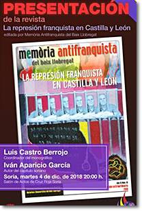 Castilla y León cuenta con, al menos, 16.189 desaparecidos-asesinados. Esa cifra supone entre un 0,7 y un 0,8 por ciento de víctimas mortales de la población de entonces, un porcentaje similar en todas las provincias de Castilla y León. A este número habría que sumar prisiones, rapadas, robos de bebés, depuraciones, violaciones, torturas, muertes por enfermedad, reclusión en campos de concentración, que incluiría y un largo etcétera para comprender lo que supuso la represión que acompañó al levantamiento militar de 1936. La cifra parte de las investigaciones llevadas a cabo por las propias asociaciones de memoria Histórica y los historiadores que han estudiado los escasos archivos a los que se tiene acceso. Castilla y León es además la comunidad autónoma donde se han llevado a cabo más exhumaciones. En los dieciocho últimos años, en la Comunidad se han excavado 215 fosas comunes clandestinas donde se han encontrado los cuerpos de casi 2.000 personas enterradas en ellas. Si se tiene en cuenta que únicamente se han exhumado los restos mortales de estas 2.000 personas, eso supone que aún quedan cerca de 10.000 cadáveres enterrados en fosas comunes que se solían abrir en cunetas o junto a las tapias de los cementerios. Esta información es el punto de partida de la conferencia que el martes, 4 de diciembre, tuvo lugar en el Salón de Actos de Cruz Roja Soria. En ella se presentó la revista monográfica sobre La represión franquista en Castilla y León que ha desarrollado la Asociació per a la Memoria Històrica y Democràtica del Baix Llobregat (Barcelona). Esta revista es el octavo número monográfico sobre la represión franquista y la memoria de las víctimas. Ello presta a una reflexión sobre el estado del movimiento memorialista en las comunidades autónomas, que avanza sobre dos ejes: la iniciativa ciudadana, a través de asociaciones y familiares y, por otro lado, el apoyo institucional. Hay que destacar, como suele ser habitual en este ámbito, la relación de la práctica totalidad de los colaboradores de esta revista con el asociacionismo, más que con instancias académicas o institucionales. Se plantea la investigación, el conocimiento de la verdad, como la primera fase de un proceso que luego sigue con la reivindicación de la memoria histórica democrática. Desde ese punto de vista, memoria e historia, lejos de ser antagónicas, se complementan y enriquecen mutuamente. Este estudio cuenta con 16 artículos y una entrevista coordinados por Luis Castro Berrojo que participó en la charla. Luis Castro, Soria 1952 es profesor de historia jubilado e investigador. Miembro de la Cátedra de Memoria Histórica de la Complutense y activista dentro del movimiento memorialista de Burgos y de Salamanca. Autor entre otros libros de Burgos, Capital de la Cruzada, Burgos en la Guerra Civil, El recuerdo de los caídos, Políticas de memoria en la España contemporánea, Iván Aparicio García ha desarrollado el capítulo dedicado a la provincia de Soria, donde recorre los distintos tipos de represión sufrida en esta provincia que cedió el poder a los militares y cuenta con, al menos 586 desaparecidos-asesinados, todos excepto uno sin juicio previo. Un repaso a las publicaciones, los 12 años de Recuerdo y Dignidad, las exhumaciones y la perspectiva desde el punto de vista de los derechos humanos de la Asociación soriana completan el artículo dedicado a Soria Iván Aparicio García, Soria 1975 es activista de Memoria Histórica y Derechos Humanos y Presidente de Recuerdo y Dignidad.