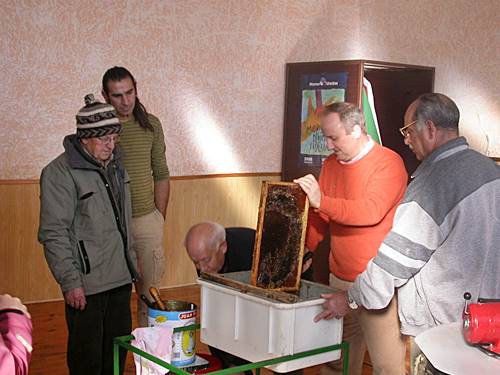 panales de la colmena, limpiando la cera, mostrando opérculos, polen y