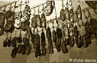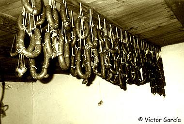 lomos metidos en la hoya del adobo y con los jamones colgados en el techo