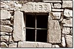 protegida por un pórtico más moderno. Es de mampostería y conserva en su