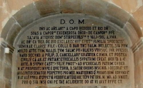 D.Antonio Campo Redondo, y Río, Cavallero professo del Horden del Señor Santiago, Licenciado en ambos Derechos, Retor y Cathedratico de Leyes en esta Universidad, Colegial de S. Bartolome de Salamanca, Alcalde de Corte de la Chancillería de Granada, y Oydor en ella, y en esta, y en el de Hacienda, y Contadurîa Maior, del Consejo y Camara de su Magestad, D.Phelipe IV. y Presidente de el de Hacienda, tomó el Patronato de este Combento, y Capilla Maior, y lo dotó para sí, y sus sucesores año de mill, seiscientos, y cuarenta, y ocho, y cinquenta, y dos, sus padres, y hijos están enterrados en esta vóveda, y la Señora D.Margarita de Cevallos, su Muger.