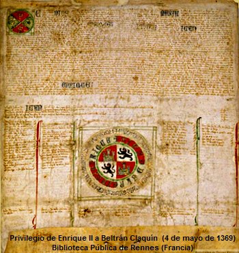 Por ende queremos que sepan por este nuestro (7) privilegio los que ahora son o serán de aquí adelante, cómo Nos Don ENRIQUE por la gracia de Dios Rey de Castilla, de Toledo, de León, de Galicia, de Sevilla, de Córdoba, de Murcia, de Jaén, del (8) Algarbe, de Algeciras, y señor de Molina; reinante en uno con la Reina Doña JUANA mi mujer, y con el infante Don JUAN mi hijo primero heredero de los nuestros reinos (9) de Castilla y de León; por conocer a vos el nuestro muy caro amigo mosén Beltrán de Claquín conde de Longa Villa, que al tiempo que Nos entramos en los nuestros reinos de Castilla (10) y de León la otra vez en el año de la era de mil y cuatrocientos y cuatro años [año 1366], vos el dicho mosén Beltrán vinisteis con Nos por nos acompañar y ayudar a cobrar los nuestros reinos, y trajisteis todas las más (11) gentes de armas que vos pudisteis en nuestro servicio.