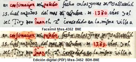 Ahora bien, el hecho de haber utilizado una reproducción fotográfica en lugar de la copia del manuscrito Mss-3452 accesible en la Biblioteca Digital Hispánica de la Biblioteca Nacional de España ha supuesto que sus resultados no sean los más adecuados; ya que si bien Soriano Calvo ha intentado mantener la puntuación y, ocasionalmente, la grafía del original, éstas, al menos en el facsímil editado por dicha Biblioteca Nacional, no se representan adecuadamente, tal y como se puede observar en las palabras resaltadas en la imagen adjunta, donde la diferencia entre el 1380 del facsímil y el 1389 de la reproducción digital provocó el error que publicamos en 2014 y corregimos en 2018. Así pues, es fácil de comprender que existan diferencias entre lo que consta en la 'Actualización' de Soriano ahora publicada y el texto que realmente debería constar en la misma.