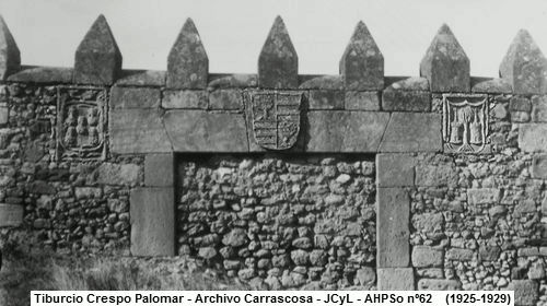 Por otro lado, si adaptamos las medidas que se indican para la obra ejecutada por Solano a lo que se ve en la fotografía (almenas de 98cm de alto, separación entre ellas de 84cm, y puerta de 1,20m de ancho), este tramo de pared no correspondería al trabajo ejecutado por este cantero, por lo que habría que pensar que ya existía anteriormente, y por tanto la datación del escudo de los Morales debería ser anterior a 1590; una datación posterior a ésta no parece razonable, ya que si fueran posteriores las armas del yerno estarían esculpidas en el dintel.