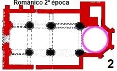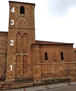Desde el exterior, la torre consta de dos alturas diferenciadas divididas en dos tramos por una imposta de billetes continua. El piso de más abajo cuenta con cuatro altos arquillos ciegos geminados dispuestos en dos niveles, muy esbeltos, estrechos y prolongados. Los inferiores (núm.1) son de medio punto y los de arriba ligeramente apuntados, sin ningún adorno a destacar (núm.2). Este tipo de arcos (núm.2) no corresponde con los que se ven en el interior, ya que en esta altura, en cada uno de los frentes existía un amplio arco de medio punto cegado en la actualidad. Con atención aún se puede ver el del lado oeste semioculto por las capillas laterales. Los paramentos que dan al sur están tapados por el convento con lo cual no tengo conocimiento de su aspecto. Sobre la imposta, que separa este tramo del superior (núm.3), se ven los huecos de los cuatro grandes arcos lisos de medio punto que debían albergar el primer campanario, ahora cegados. Finalmente, en el tramo más alto (núm.4) existen cuatro arcos de medio punto abiertos por los que hoy en día se ven las campanas. Si uno se fija en los sillares se puede observar que existía una gran ventana cuadrada que posteriormente fue tapada para construir los arcos mediante la misma técnica60. El núcleo central de la torre mantiene, en mal estado, una reciente (*) escalera de metal que conduce desde abajo hasta el cuerpo de campanas superior61.
