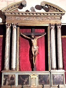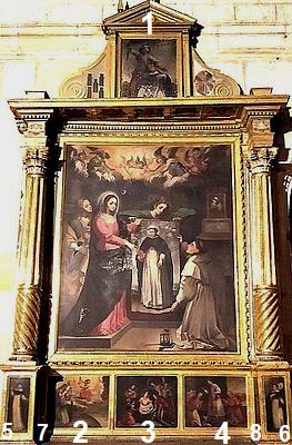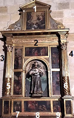 - Ítem. Con condición que el dicho retablo ha de llevar el pedrestral sus marcos según y como está en el retablo que está en la capilla mayor en el retablo de la iglesia de la Compañía de Jesús de esta ciudad.
