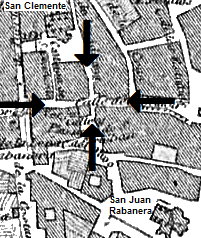 1703, 9 de Junio. Se hipotecan para un censo unas casas en la cuadrilla y colación de San Clemente que han por aledaños por la parte de adelante calle real que baja del Hospital de Santa Isabel para la plazuela de San Clemente