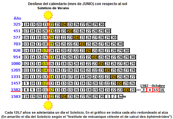 tenía un desfase entre el método de cuenta y la posición solar que hubo que corregir en 1582, año en el que del 4 de Octubre se pasó al 15 de Octubre
