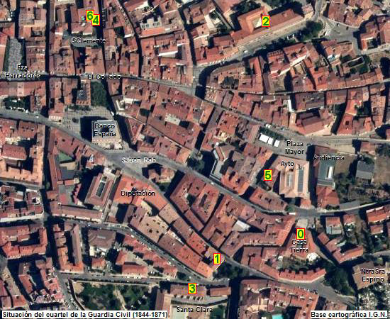 Así pues, matizando desde ahora que hacemos alusión sólo a Soria capital, mostraremos los datos localizados sobre las sedes en las que se ubicó la Casa-Cuartel de la Guardia Civil, pues a mí, desconocedor del tema, me sorprendió mucho que desde Diciembre de 1844, cuando se inició la instalación de la fuerza, hasta 1871, poco más de un cuarto de siglo, realizaran seis traslados; no sé si fue lo habitual en otras capitales, o si realmente es que, como se suele decir, Soria es así.