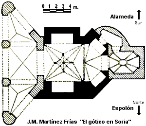 El citado Martínez Frías nos presenta un dibujo de la planta diferenciando la fábrica gótica (tono sólido) de la que no lo es (rayado) (fig.1)