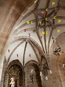 - Ítem; por cada vara de la crucería y formas de los lunetos y mazas, tirándose vara tirada pasando de largo por las mazas, midiendo las dichas mazas con todas correspondencias, como es crucero y brazaletes que vienen a injertarse todos en ellas, a doce reales la vara.