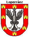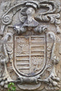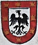 un escudo con una agila engrisada, en campo blanco. Tiene este escudo por orla ocho castillos dorados en campo y orla colorada.