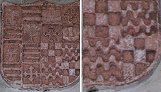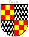 Rueda 1598: Cuartelado; 1º y 4º jaquelado de rojo y oro de tres puntos. 2º y 3º tres ondas de veros negros en campo de plata