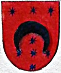 luna de plata en menguante, en medio del escudo, en campo de sangre, y ocho estrellas azules.