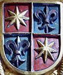 en quatro quarteles. En el 1º y 4º dos estrellas de oro en campo de sangre, y en los otros dos en cada uno una flor de lis de plata en campo azul.