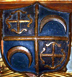 cuarteado con dos medias lunas en campo azul, y dos cruces de sangre floreteadas en campo de oro.