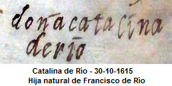 (f.31v) Del apellido de los Ríos hay gente principal en las ciudades de Córdoba y de Segovia /.../ En Francia hay ilustres casas que se apellidan de Río, la de Monsiur de Río que fue en servicio del emperador don Carlos Quinto cuando lo de Viena, y Madama de Río mujer de Mosiur de Guisa vino con la reina francesa doña Isabel de Balois a España, año de 1570. Han emparentado con nobilísimas casas... [y cita a] doña Catalina de Río y Salcedo /.../ y doña Leonor de Río /.../ doña Catalina de Río /.../ cuya hija doña Catalina de Luna y de Río /.../ el comendador Antón de Río, y don Pero González de Río...