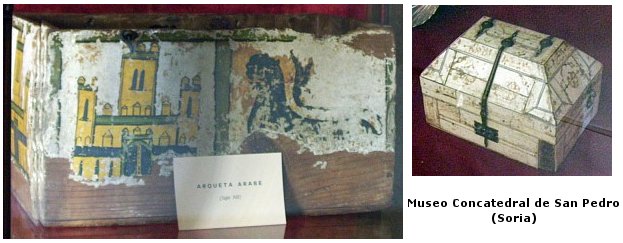 Por otro lado conocemos la existencia de dos 'arquetas' que aparecieron junto a los pies de una momia en el claustro de la Concatedral (Loperráez, T-II, pag.125; Rabal, pag.240); sobre esta 'momia' que Higes Cuevas ('Interpretando a Enrique Cock', Celtiberia 13, pag.51) parece aceptar la datación de 1192 y se pregunta si podía pertenecer a alguno de esos personajes reales citados; a mi entender, no parece posible, ya que el 'arquita de nogal' tiene pintados un castillo y un león, y si las 'armas' de Alfonso VIII fueron simplemente un castillo, sería extraño que sus 'hermanos, descendientes del Ilustrísimo Emperador', o sus 'hijos' Alfonso y Sancho ostentaran las armas figuradas en la cajita (Nota.- No he encontrado referencia a un hijo llamado Alfonso entre la descendencia de dicho rey Alfonso VIII)Fin nota.( ver foto arquetas aparecidas junto a la momia citada )