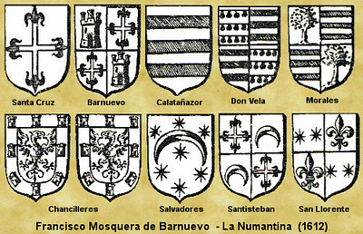 Por otra parte en los versos de "La Numantina" expresa: Veros de plata tiene por blasones / en el espacioso campo, denegrido, / tres Barras de oro en sendos cuarterones / con sangre el sitio donde están, teñido.