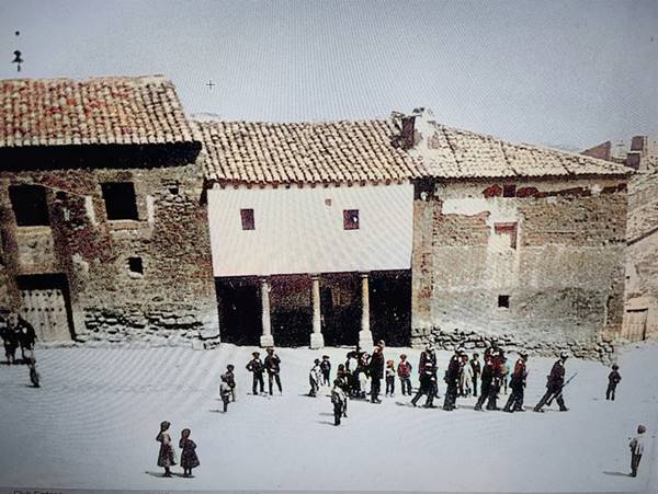 La Guardia Civil de Serón desfilando hacia su acuartelamiento. De fondo, el Ayuntamiento en donde posiblemente el Chupina estuvo encarcelado en uno de sus calabozos. Foto Manuel Cerrada Zoya, 1909.